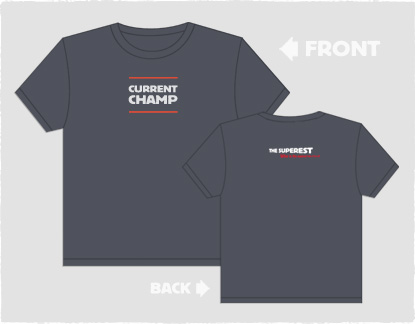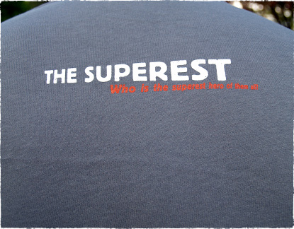 Printed on 50% cotton, 50% polyester, American Apparel, Asphalt. The sizing is unisex. I mean... unisexy. "The Superest" is printed on the back, adding to the sexiness.